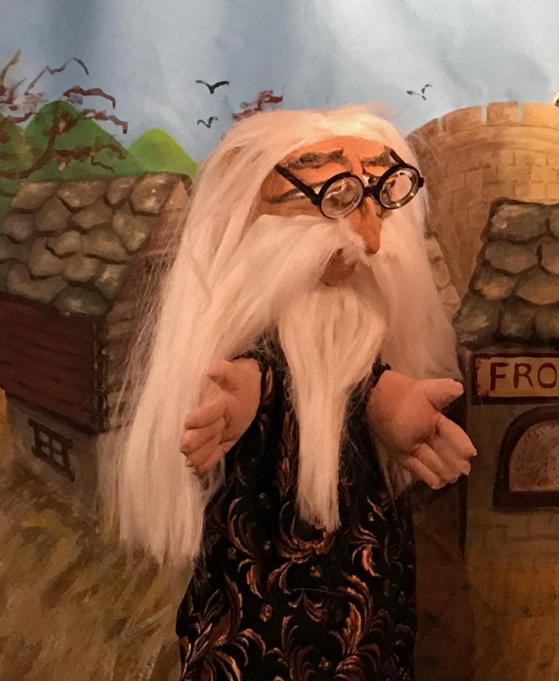 Vieil homme aux cheveux, moustache et barbe blancs, vêtu d'une robe noire à motifs dorés, il porte de grosses lunettes rondes