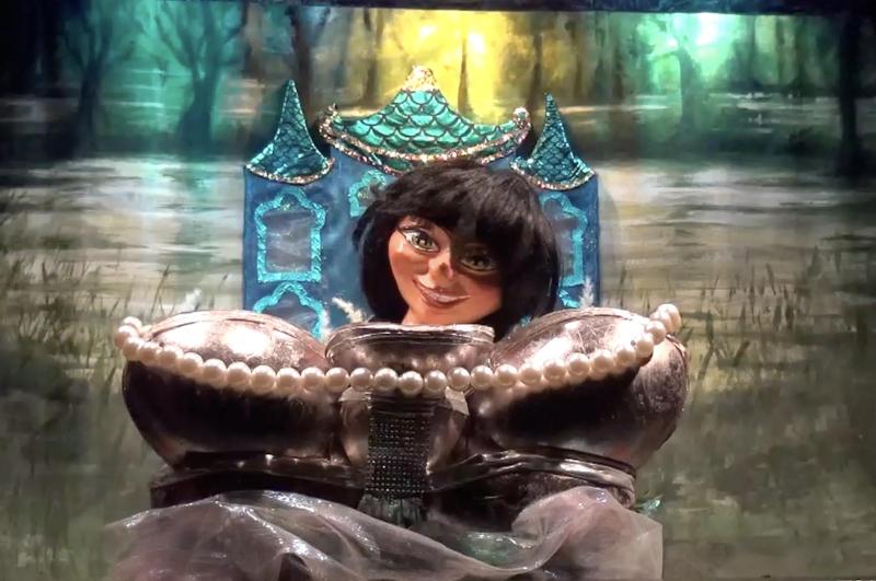 Perle d'Or arrive vers un marais au milieu duquel se trouve un magnifique château bleu. Elle cherche la barque que les lutins lui ont dit de prendre et la voit au loin, cachée derrière des rochers. Elle la tire à elle et rame jusqu'au palais. Arrivée à destination, elle frappe, la Dame aux perles lui répond que la porte est ouverte et qu'elle peut entrer, ce que Perle d'Or fait sans se faire prier.